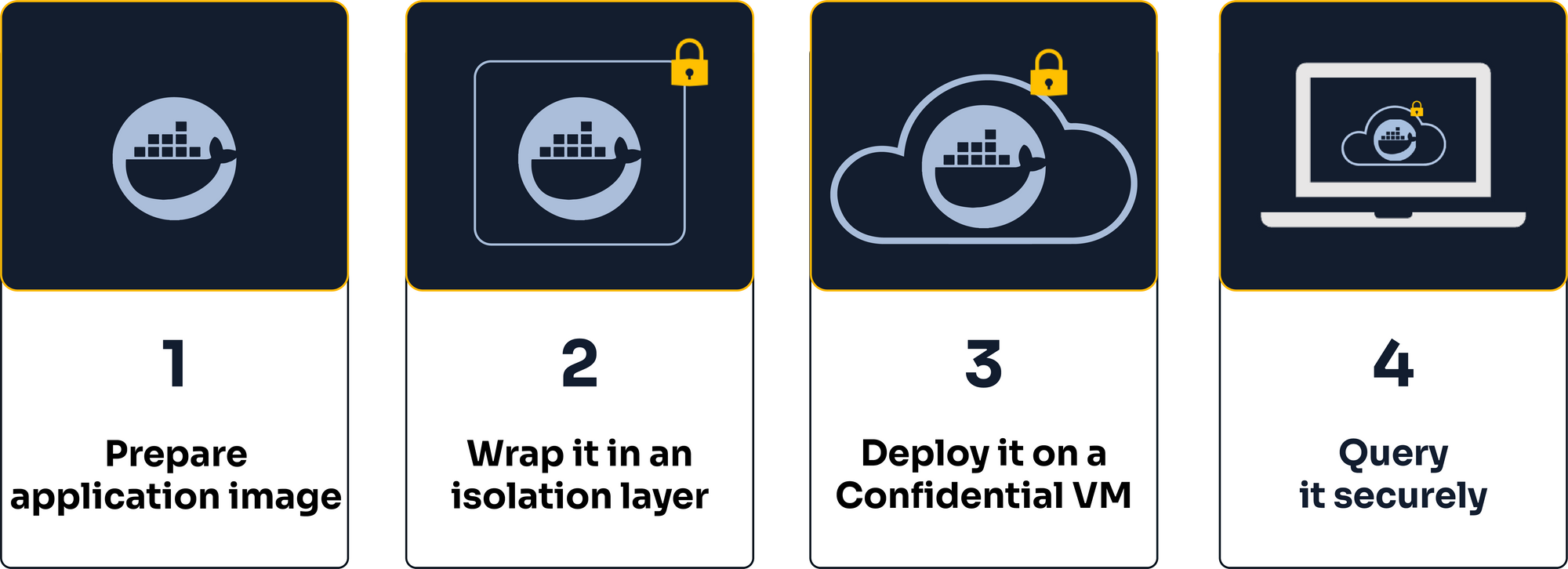 We leverage confidential containers on Azure Container Instances (ACI) to provision the low-level layers, from sourcing the right secure hardware to providing the software layer to run Docker images. This is done by provisioning containers leveraging AMD SEV-SNP technology.