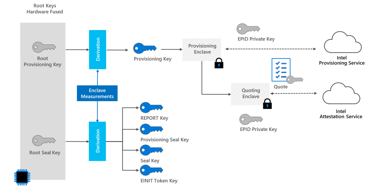 Each CPU that supports SGX contains these two root keys. The RPK enables remote attestation of the CPU, and the RSK enables sealing. These two features are core to what SGX provides.