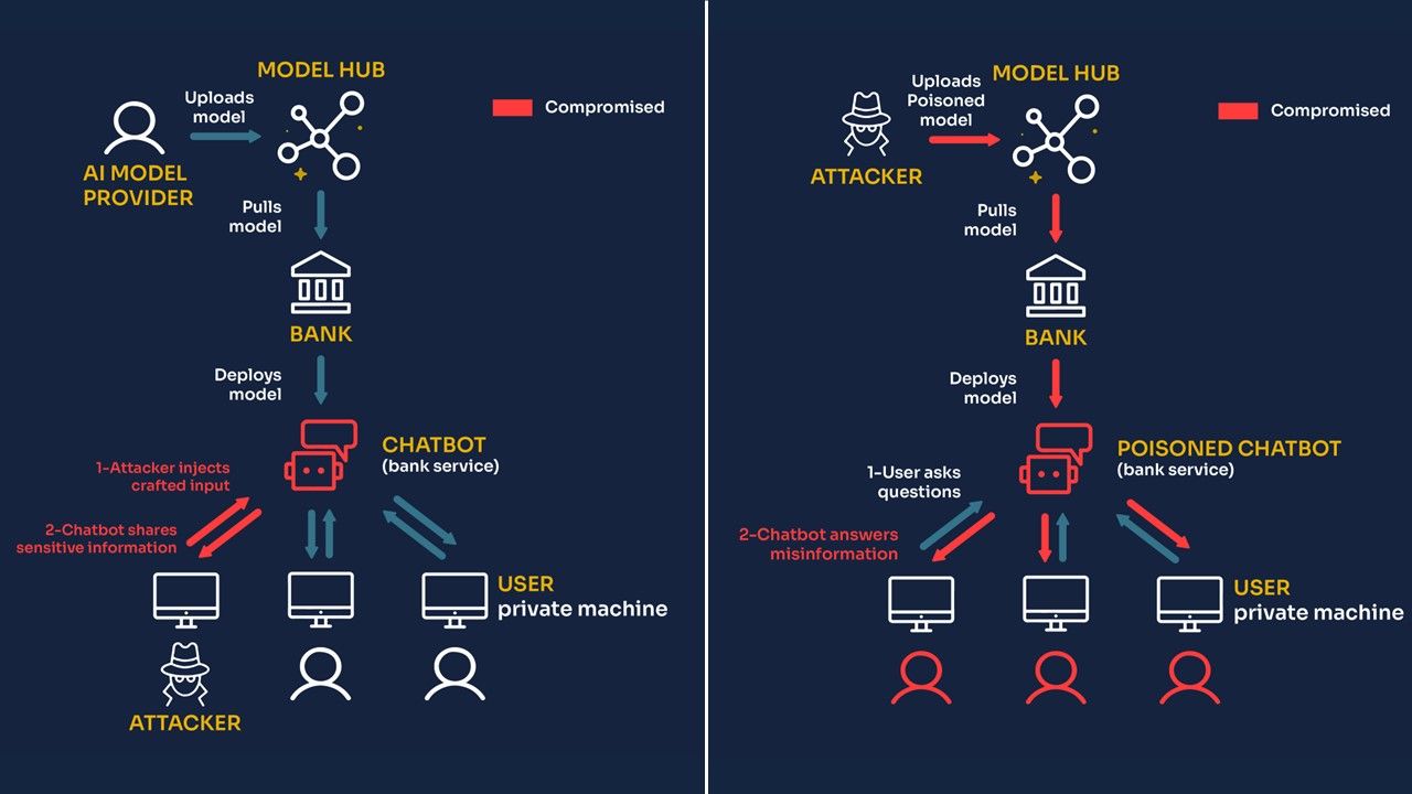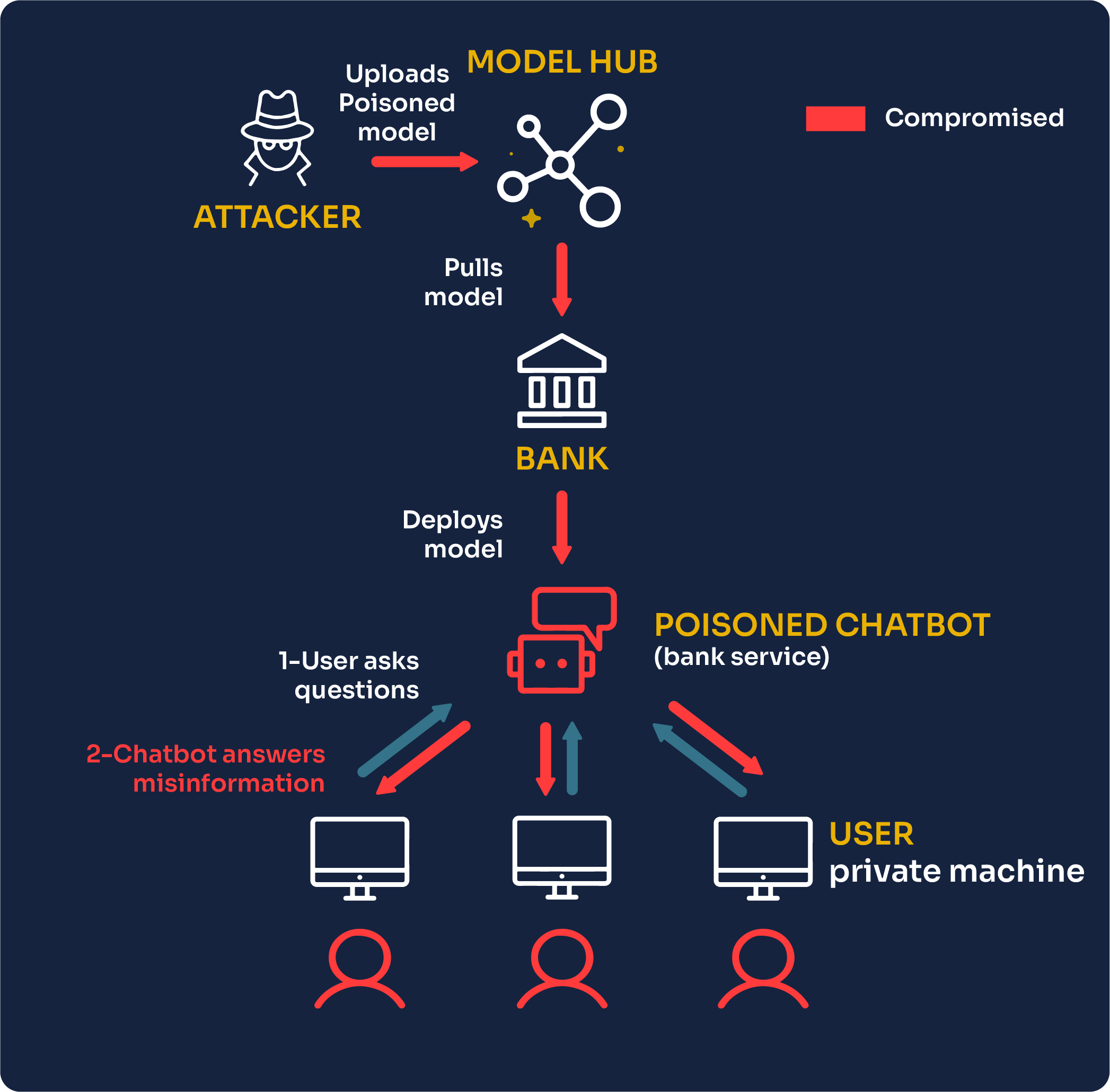 In that scenario, the attacker is not the user but one of the AI model providers that uploaded an open-source model on one of the AI model hubs. The bank engineers who pull the model from the hub for their needs will unknowingly use a model with malicious behavior.