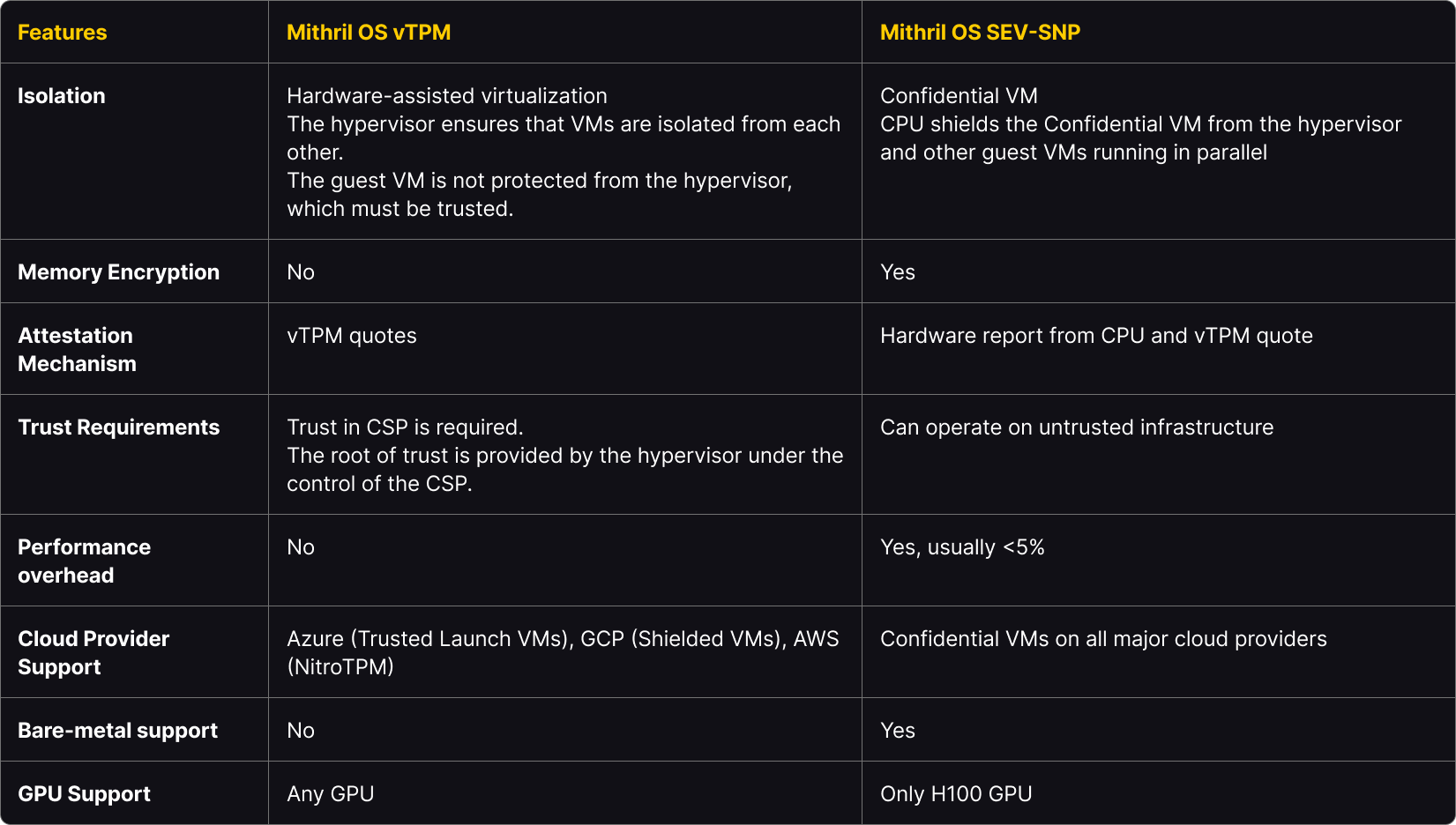 In essence, Mithril OS SEV-SNP is designed for highly secure deployments on potentially untrusted infrastructures. It provides robust memory encryption and leverages the attestation mechanisms in the CPU and GPU. It is ideal for applications requiring stringent data protection and confidentiality.