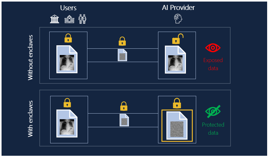 This is done through isolation and memory encryption of enclave contents by the CPU. By sending data to this secure environment to be analyzed, hospitals and patients can have guarantees that their data is not accessible neither by the Cloud Provider nor the AI company, thanks to the hardware protection.