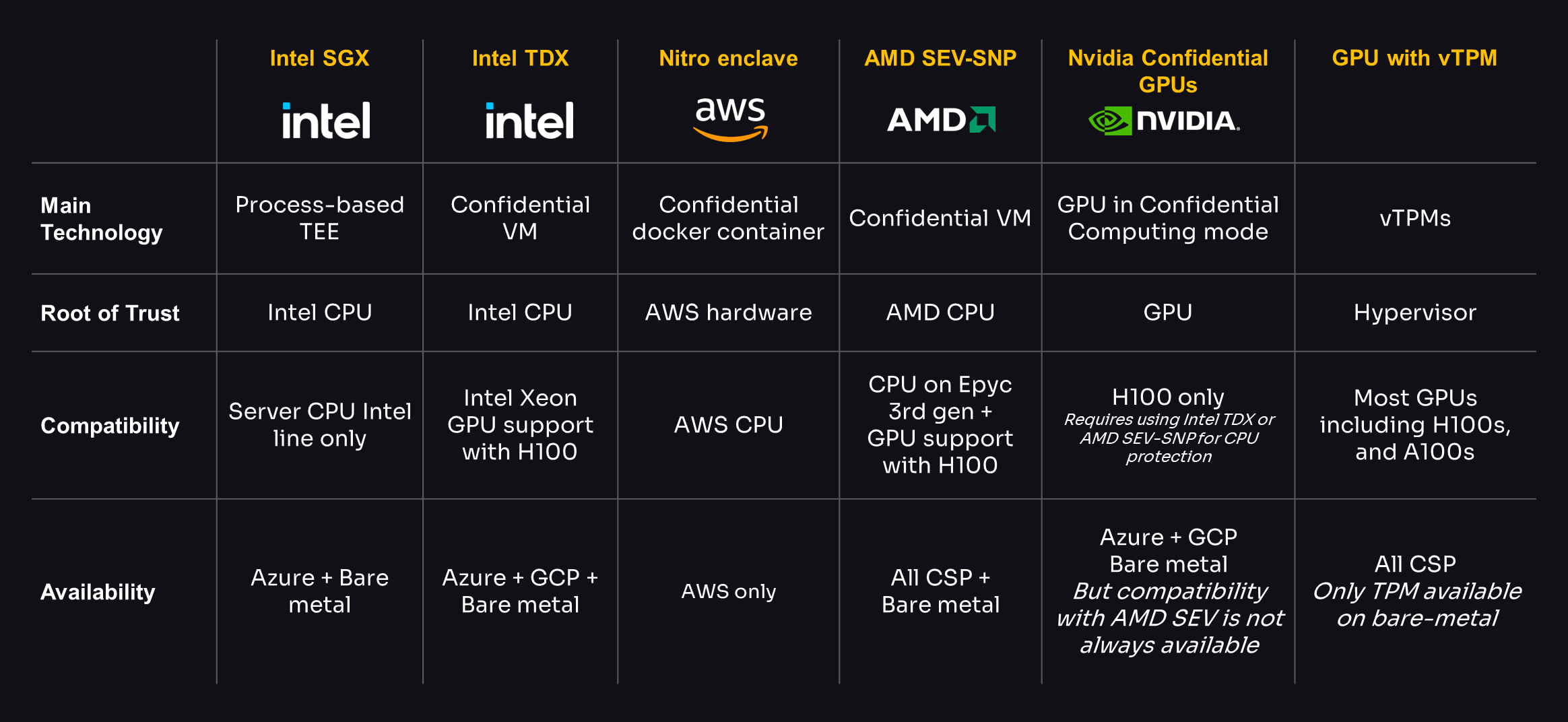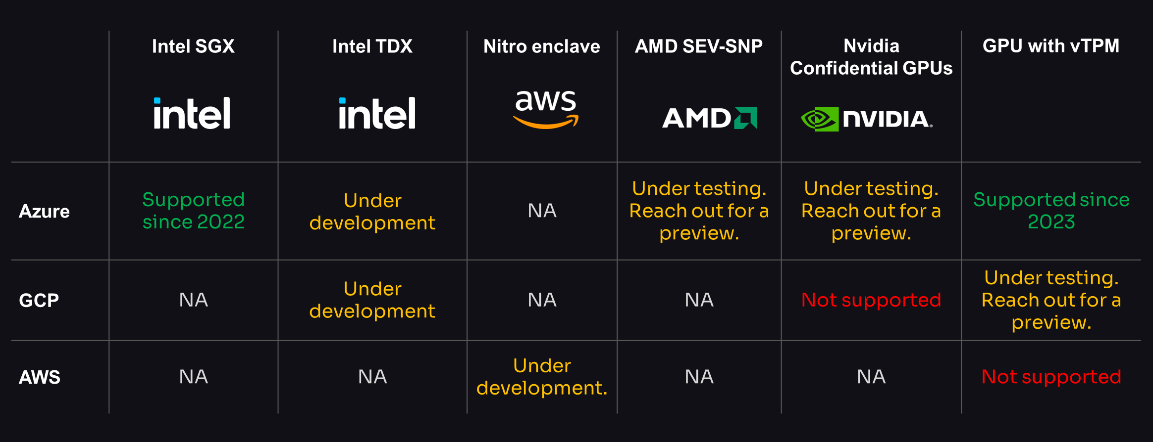 Here is a compatibility matrix for deploying our Confidential AI stack in a cloud environment, followed by comparing the main hardware for building enclaves.