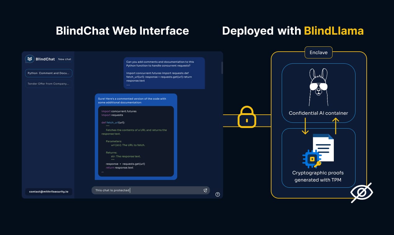 BlindLlama provides the secure backend to our Confidential Conversational AI, BlindChat. BlindChat allows users to query a Llama 2 70b model from their browser while guaranteeing that not even Mithril admins can see their data.
