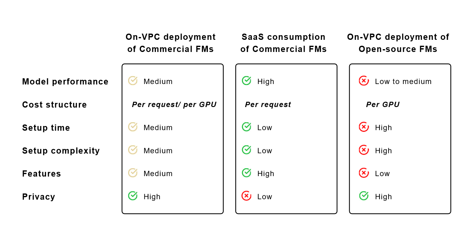 - On-VPC Commercial FMs present a balanced approach, keeping data within the enterprise VPC, simplifying deployment, and delivering good performance, even though they might not be as good as the SaaS ones.